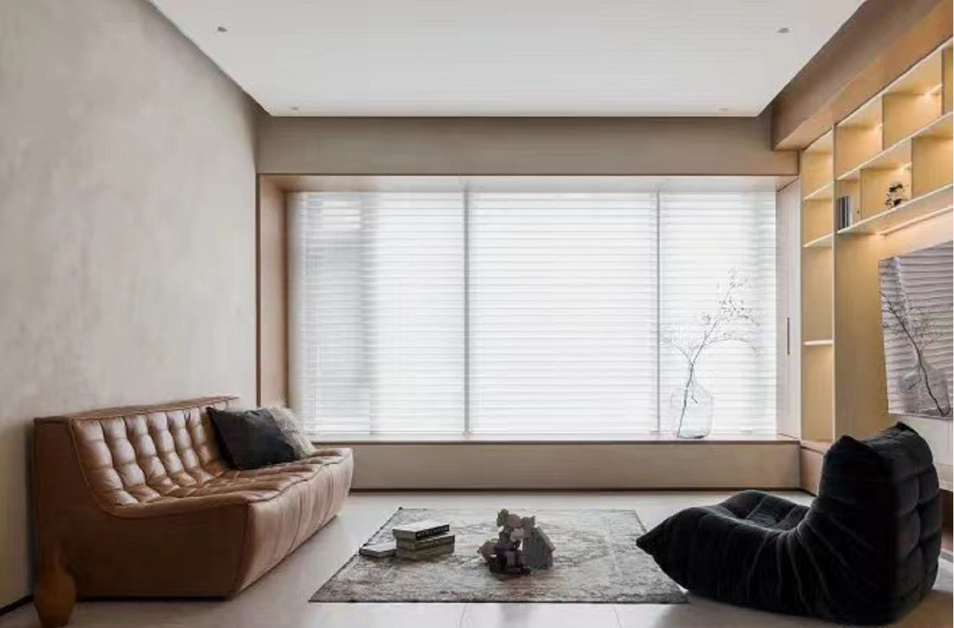 客厅采用柜体形成一体化 更加规整 暖色调的艺术涂料失眠 借助木质纹理和肌理碰撞出明暗反差
