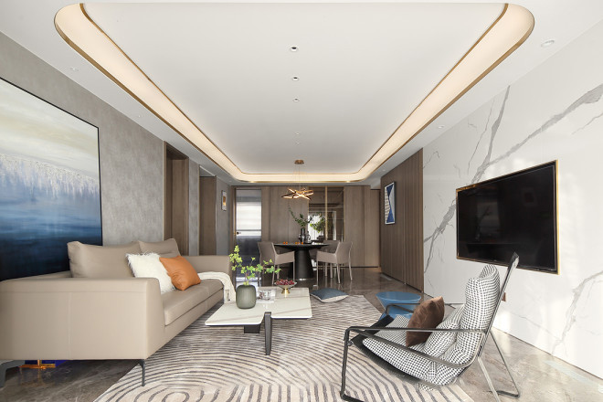 餐厅与客厅相邻,强化空间互动,相邻相随的陪伴。 灰色皮质沙发搭配石材边几组合,点缀普鲁士蓝色有高雅的时髦感,休闲慵懒。配上香槟金的落地灯,浓浓的小资格调,简约的装饰营造出时尚精致的居家氛围。