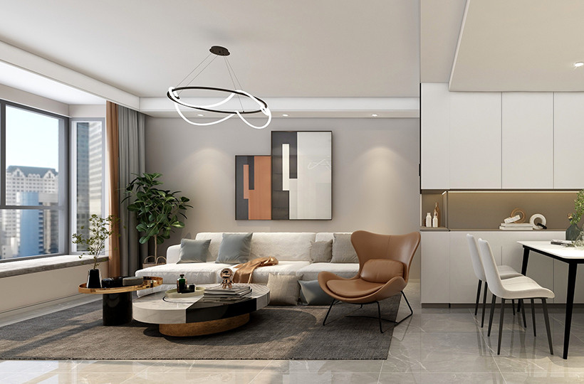 用暖灰色大理石通铺,沙发选择布艺沙发,配合橙色挂画和橙色单人座椅,一眼看上去给人干净舒适精致又统一的感觉。