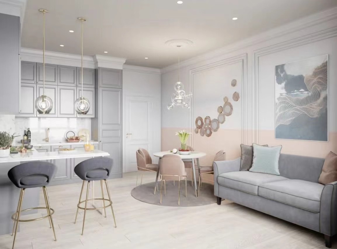 电视墙选择双色,腮红粉与浅灰色拼接搭配,金色的电视柜与玄关柜相呼应,灼灼生辉。