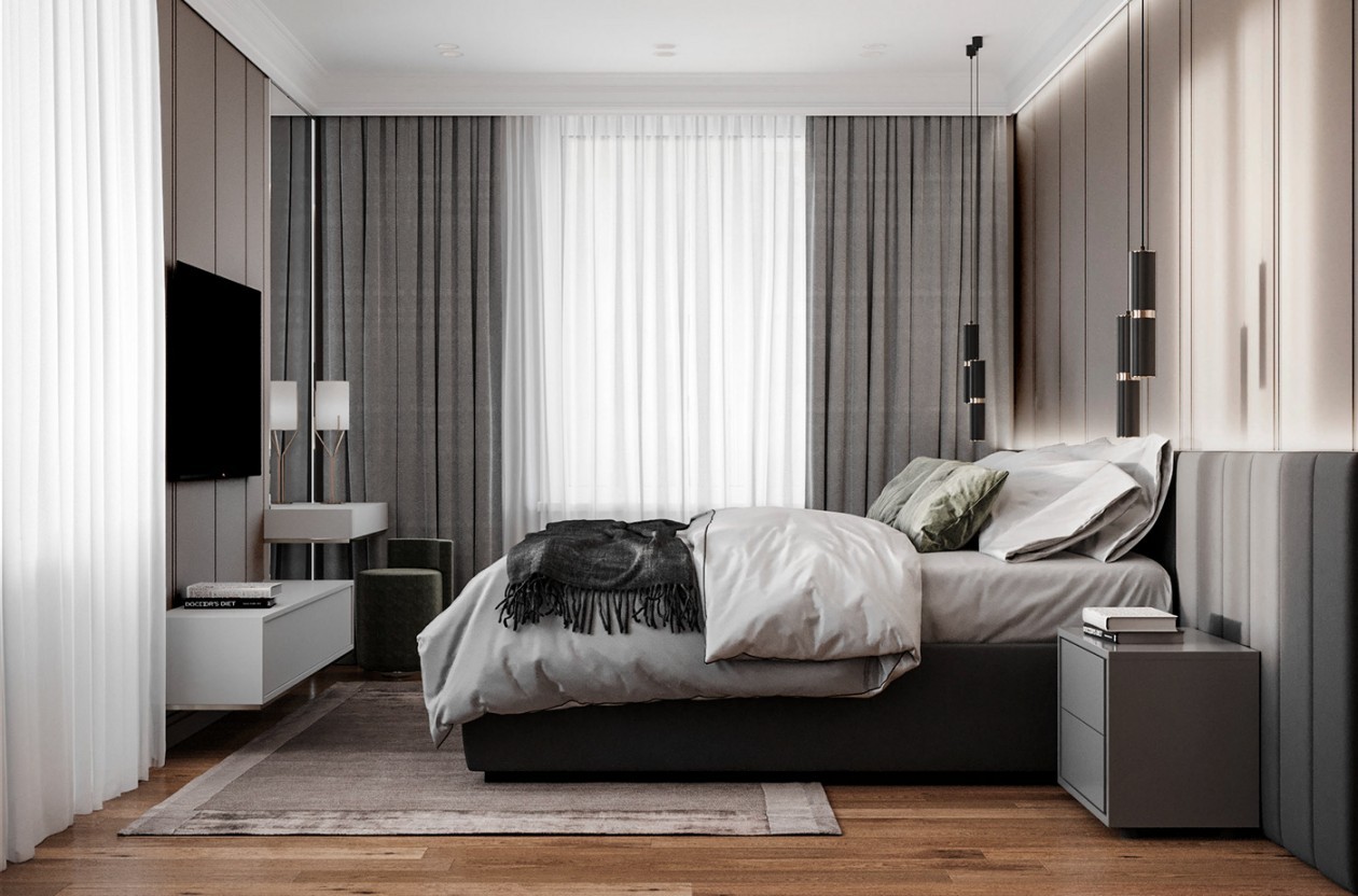 卧室风格根据业主想法添加了不少轻奢元素,金属质感的吊灯和暗藏灯带,氛围感得到很大的提升。