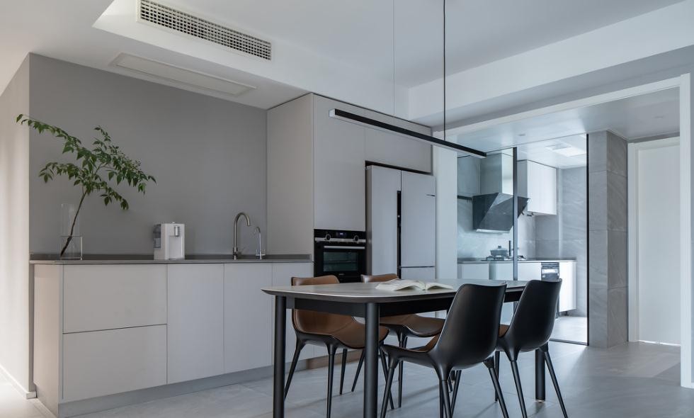 整排的开放架满足了业主大量的书籍和乐高的展示,方便随时的收纳,该展示架和主卧整体隐形门墙面完美衔接,将过道和客厅的出现的大阳角完美的弱化,同时和电视背景和过道的大阳角处理方式呼应,且材质的对比让空间更加的干净利索。 无主灯平吊顶的设计,让空间的组合更加干净敞亮,同样吊顶四周的线型反光灯带加强了空间的饿氛围,也让空间的立体感更强