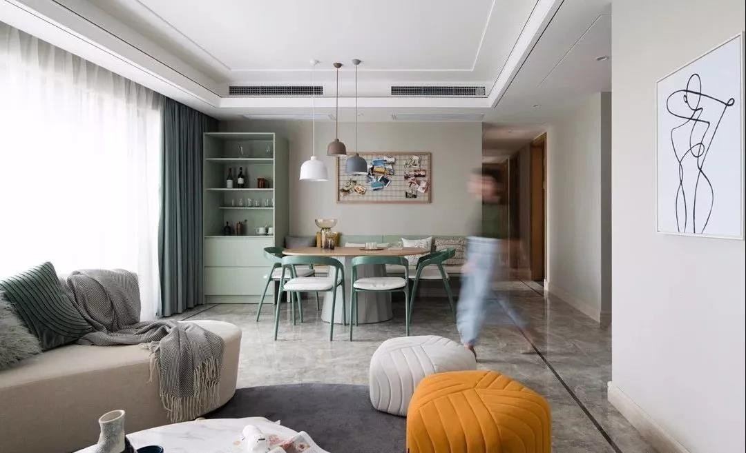 设计师以沙发&pouf组合,形成圆弧形的公区,使得沙发、pouf、电视墙三者形成互动关系,也削弱和餐厅的界限。