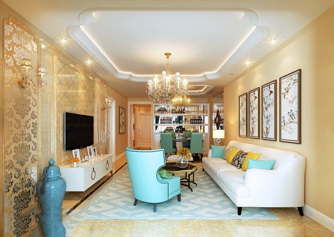 三口之家(1个可爱5岁小朋友),男主人**医药研发,女主人事业单位。刚开始沟通时,感觉空间小,做欧式风格会不会显得小及经凑!二者产生分歧,男主人喜欢欧式古典感觉风格,女主人喜欢简欧清新感觉!所以,在选色和造型上我做了简单调整,简单大气的欧式元素重复使用在顶和电视背景墙上!沙发选用的是高亮度的蓝色及配上活跃的柠檬黄!墙面浅米黄色墙漆和部分颜色家居搭配!加上灯光营造氛围!使20多平米的客厅及餐厅显得高