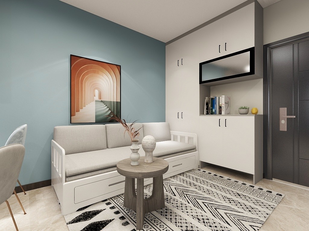 客厅的沙发床和鞋柜相邻,这个位置的空间刚刚好