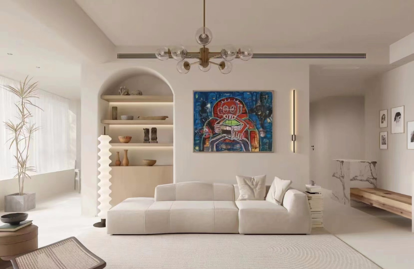 暖色调的搭配方式:整个客厅起居室不刻意的做任何一个背景,大面积的留白,让光线铺满客厅,细腻的质感家具,回归本真的生活所需。