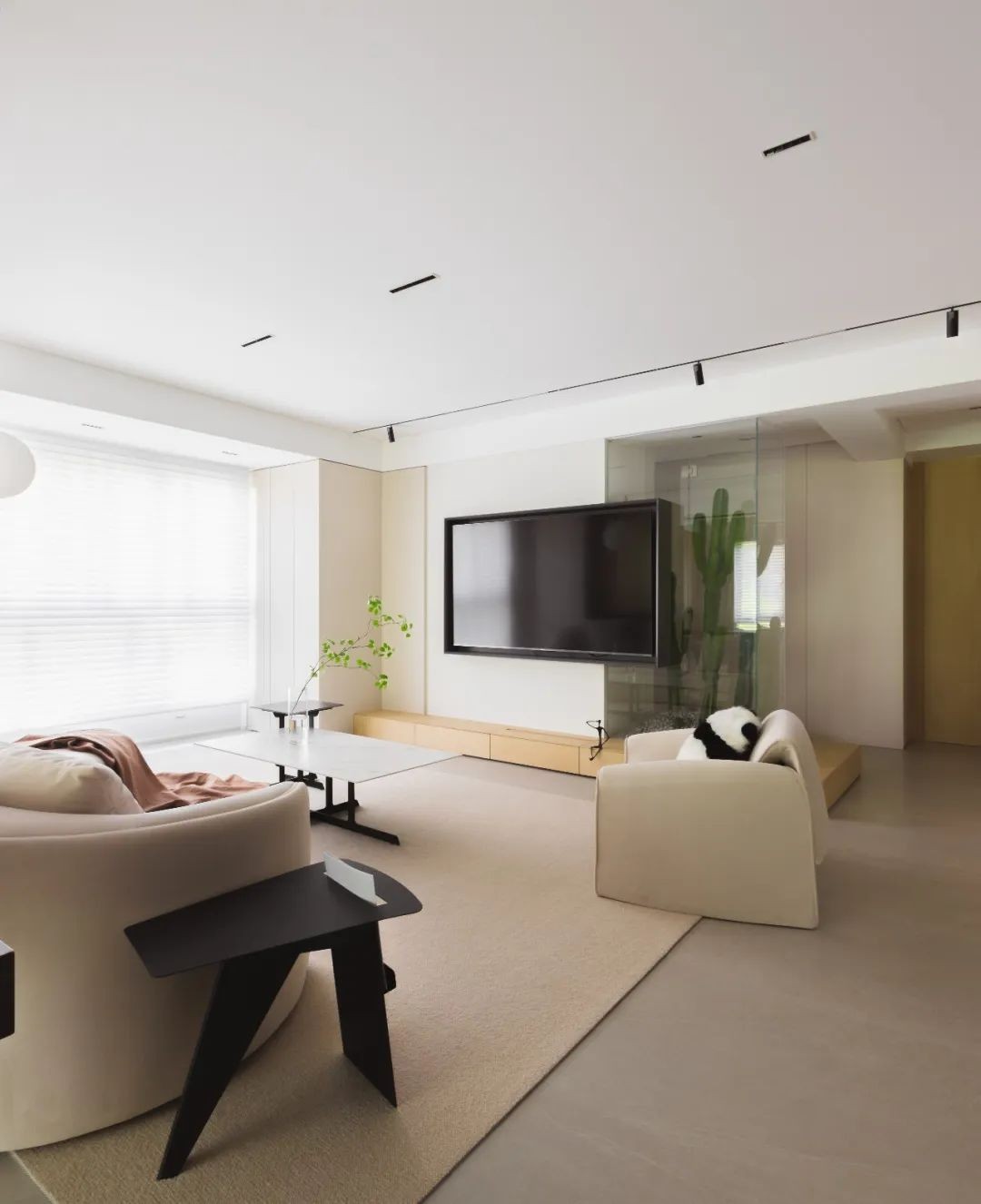 客厅打通阳台以自然光的方式为空间营造出宽敞的氛围,光与影、明与暗的变化丰富多彩。无主灯设计,让空间在视觉上更为明亮开阔,优雅简约。