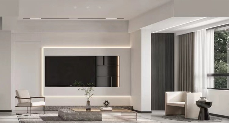 客厅布局简约,白色背景板搭配内置灯,视觉上给人大气感