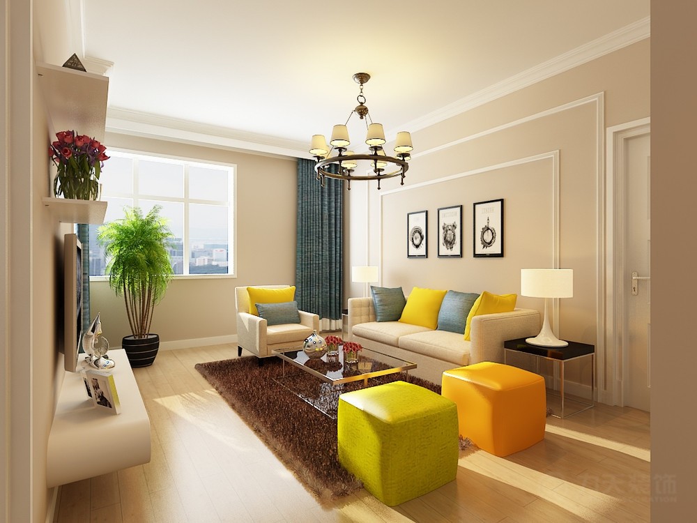 简单的沙发背景墙,搭配亮眼的沙发,让人眼前一亮。