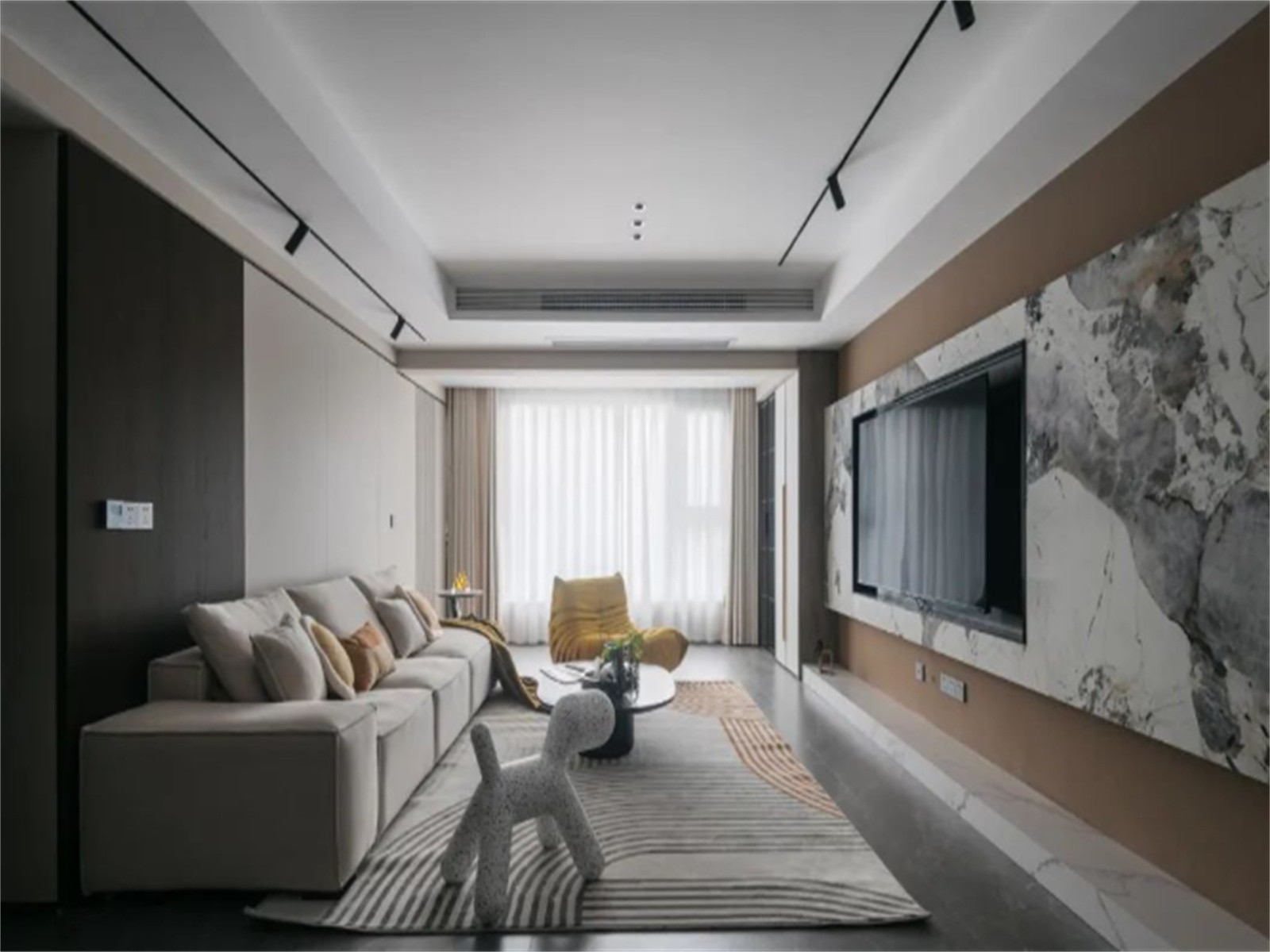 客厅,深色石纹地砖搭配无主灯顶面,轨道射灯按需点亮起居空间
