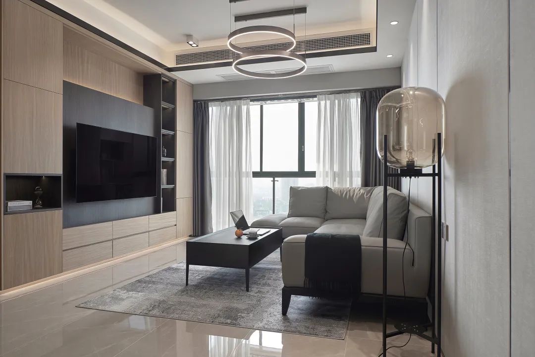 现代风的客厅,天花四周吊顶并加入筒灯的设计,在灰色护墙板与木质感电视墙的质感结合下,带来一种现代优雅的舒适大方感。
