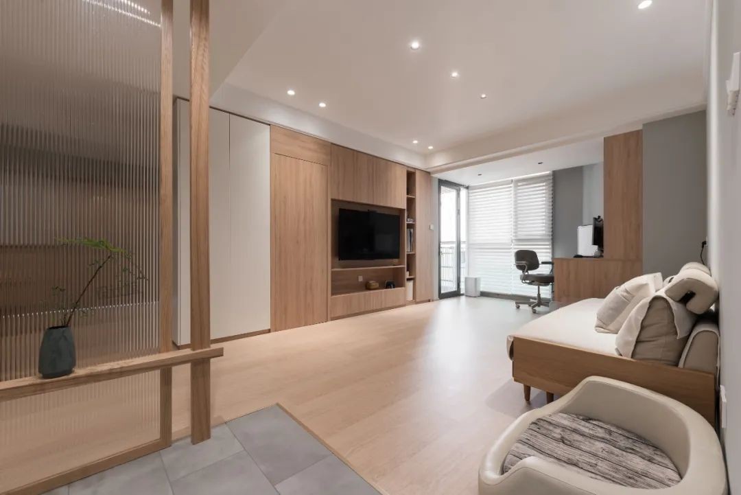 把客厅与阳台打通,使得原本拥挤昏暗的客厅变得更加开阔明亮。玄关灰色地砖+大厅木地板的地面,天花做成无主灯设计,以木质感与乳胶漆的简洁设计,让空间显得简约自然而温馨。