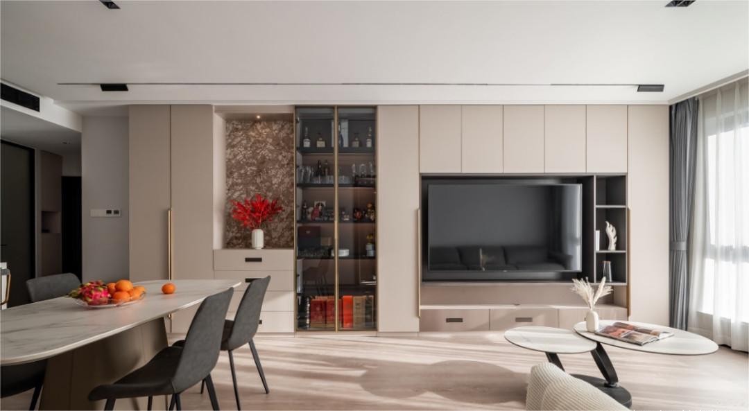 除了柜体连接客餐厅,顶面还安装了磁吸轨道灯,精致的线条由客厅延伸到餐厅,可以移动的灯具模块,能够满足多种生活场景的需要