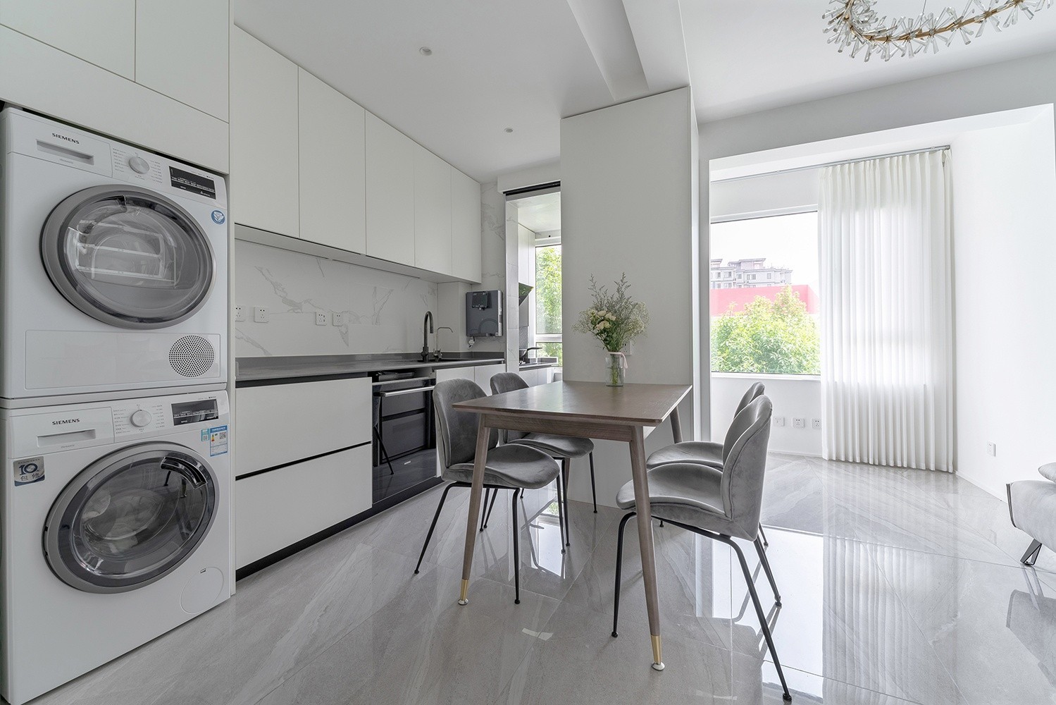 厨房入口的家政柜,内嵌了洗衣机以及烘干机。旁边是一整排操作台和收纳空间,让使用功能上得到很好的衔接。