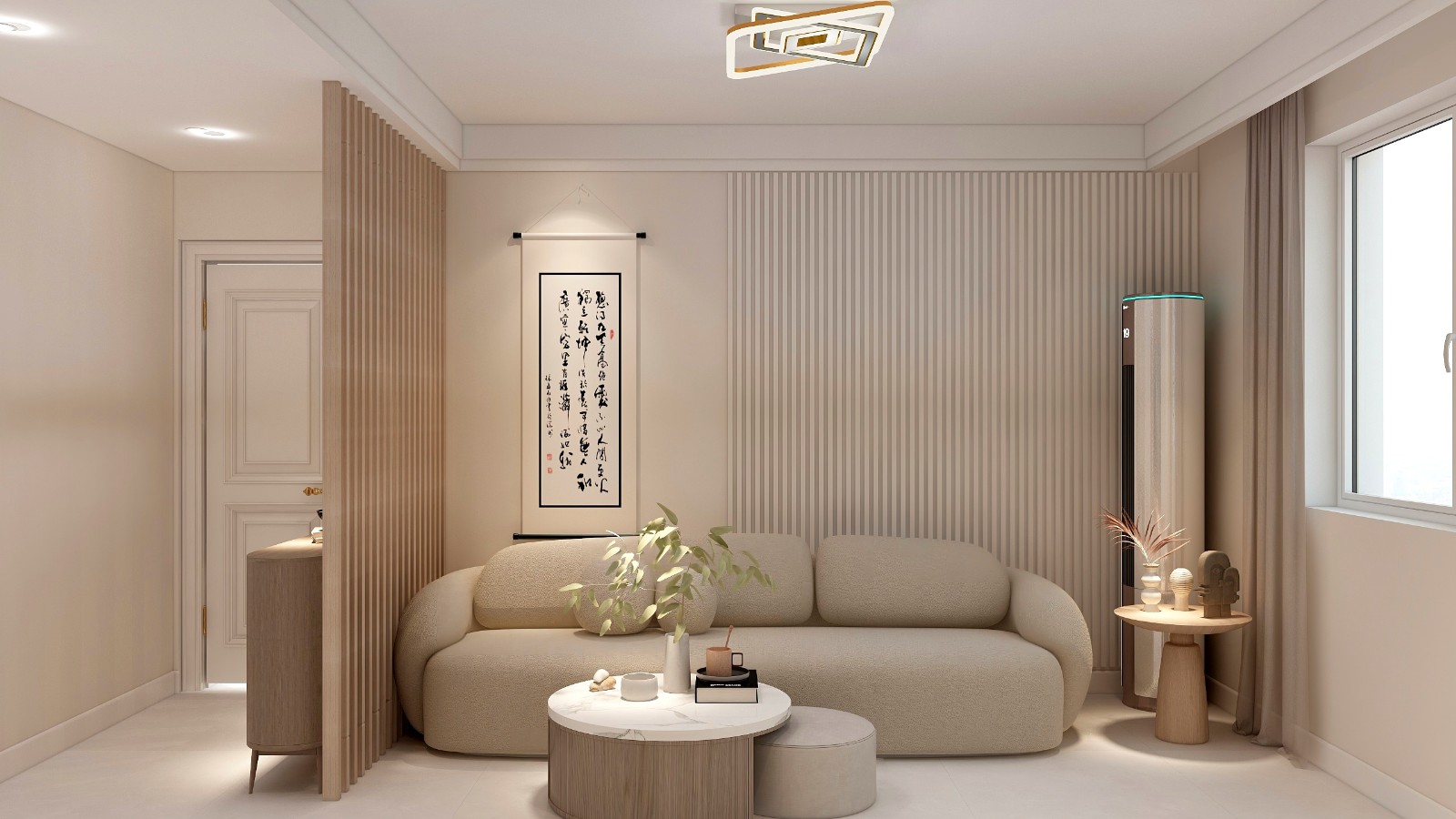 隔断柱结合鞋柜视觉分离门厅与客厅,因为本身户型较小,整体用原木色低饱和度的搭配,营造舒适温馨的起居环境