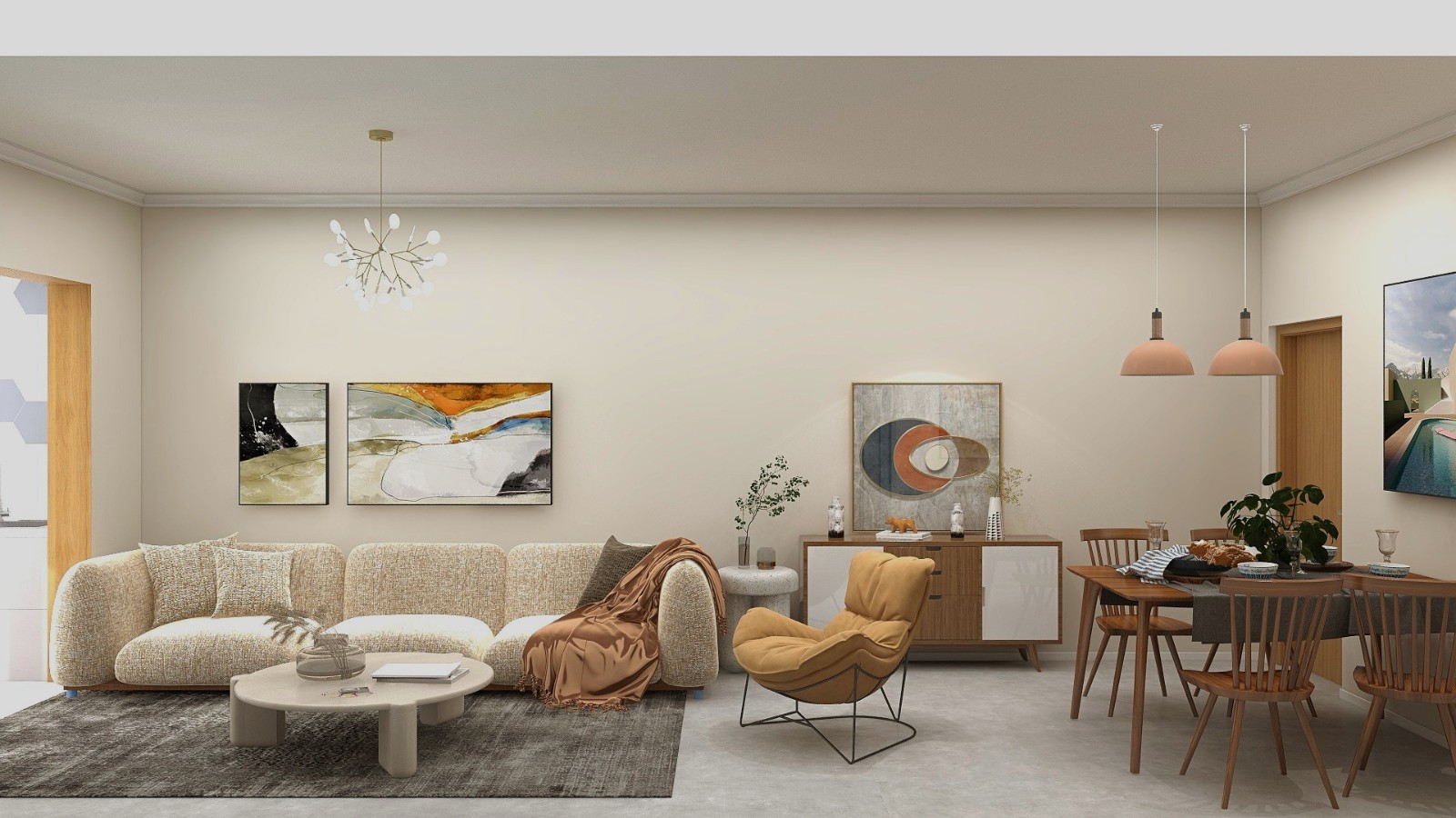 北欧简约,大面积暖色与电视墙冷色相互碰撞,让整个空间更有层次感。