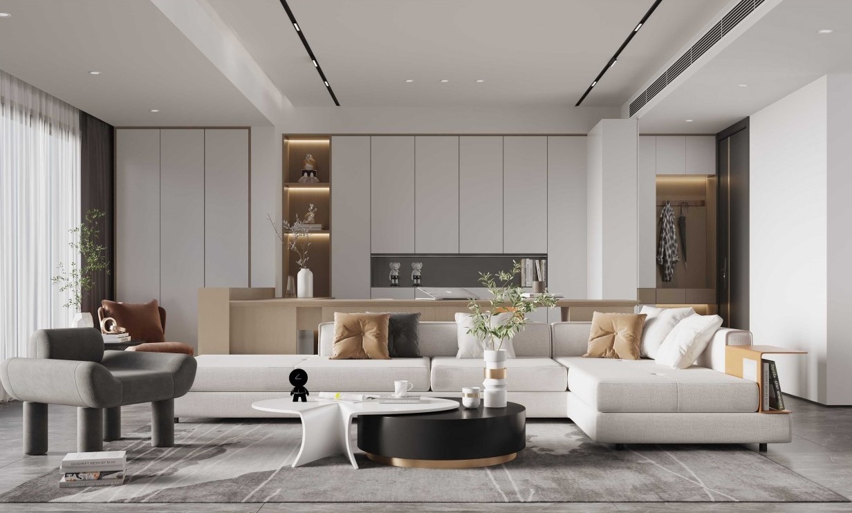 蓝与光共舞,光影的变化。 为客厅赋予了一种时间感。 设计选材上大理石岩板通透。