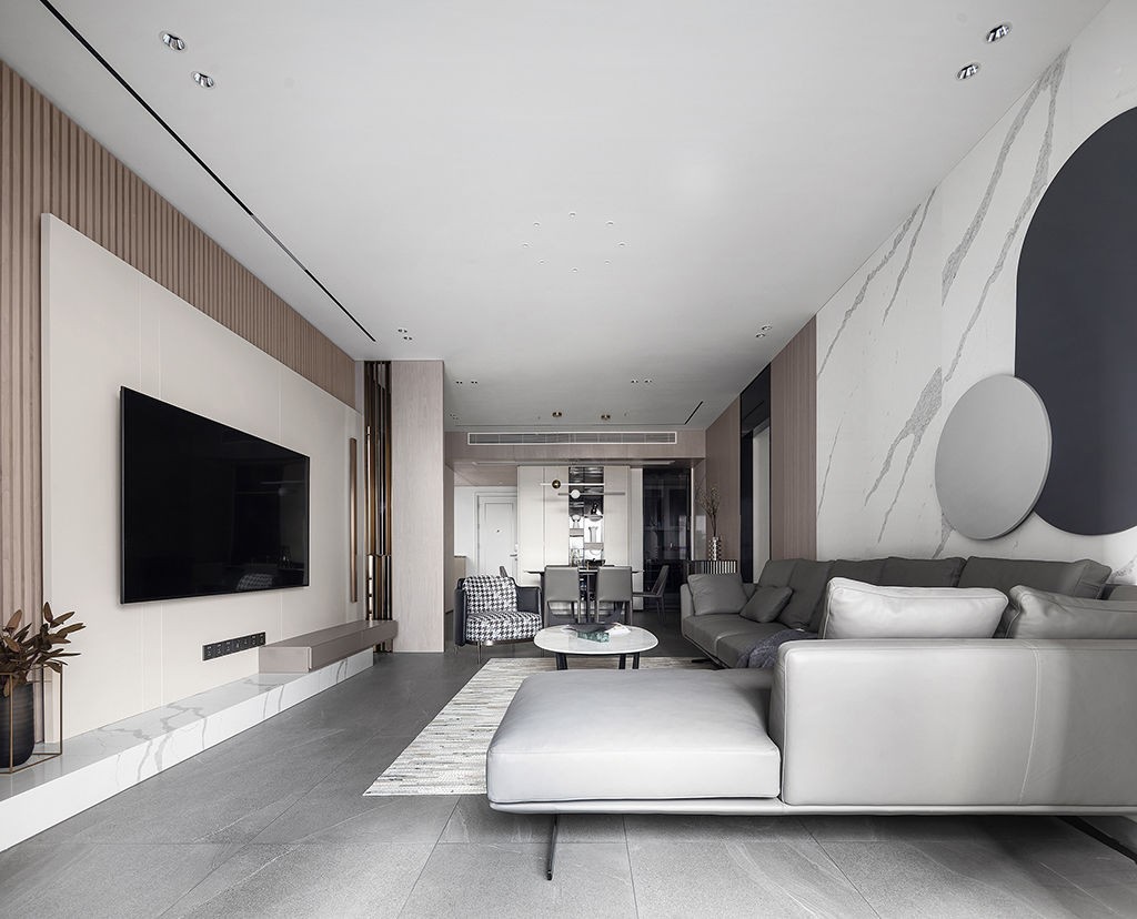 沙发背景墙由清晰纹理的浅色岩板+灰咖色木格栅及硬包构成,其上不再以挂画作为装饰,而是由一对圆形铁艺相互叠加凸显局部亮点。