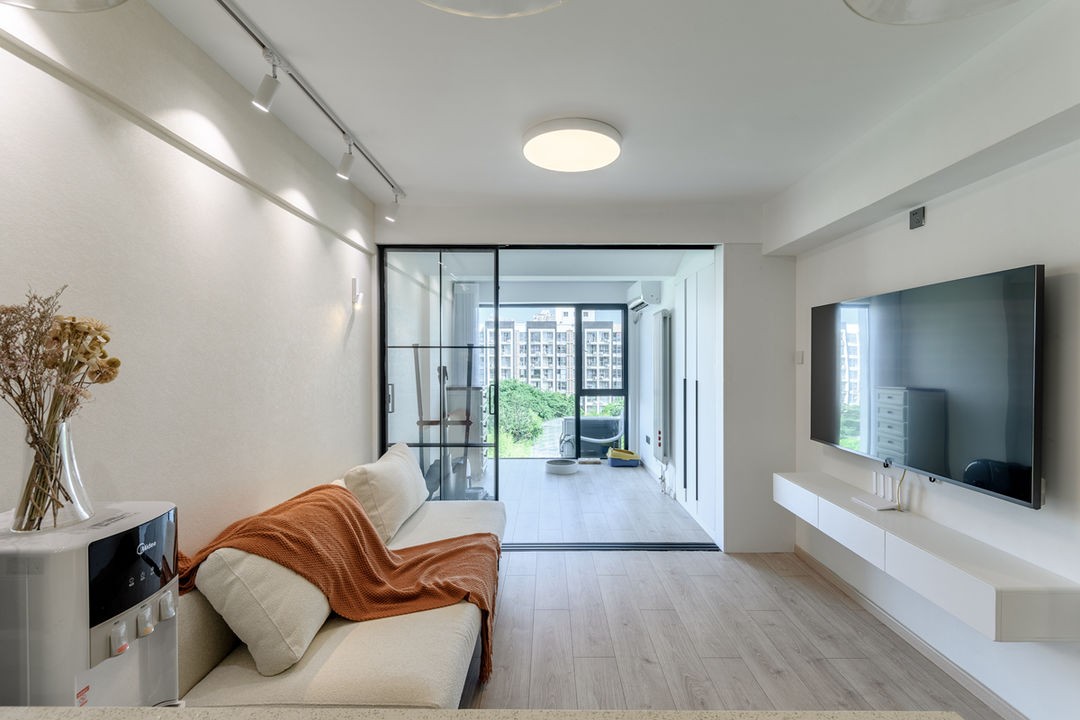 客厅采用的是白色悬空电视柜,与电视墙紧密相连,非常简洁时尚。这样如果家里有扫地机的话,进进出出无阻碍,又少了一项家务。简直不要太轻松啊。