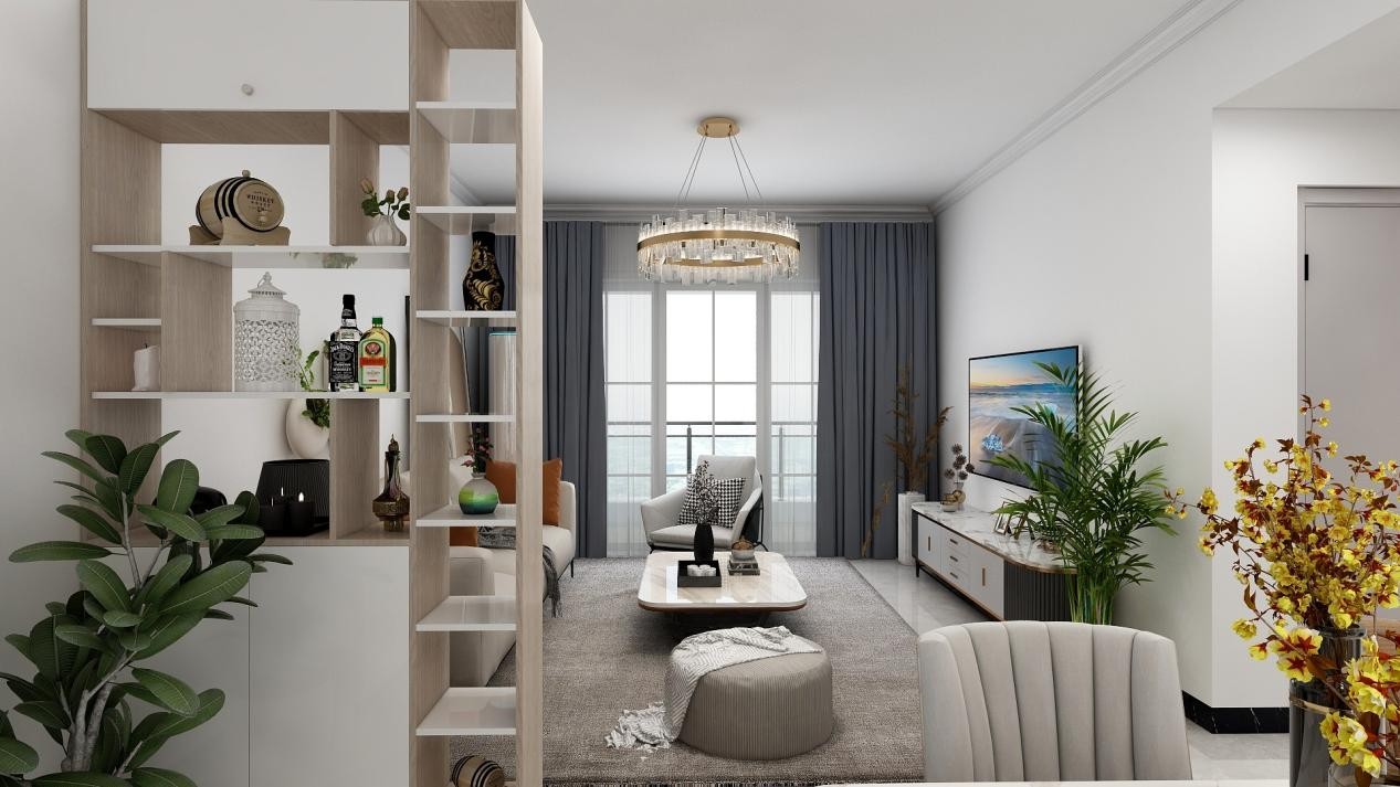 客厅|洁白的空间,圆形水晶吊灯下,布艺沙发绵软而温柔,象征着家的温暖与环抱,搭配大理石茶几,降低重心,空间更显宽敞;橘黄和条纹的抱枕、莫兰迪蓝色的窗帘、充满生意的绿植,点点滴滴的点缀,都为客厅增添了生活氛围感,在每一个清晨与日落,都能嗅到自然亲切的气息;采用了木格橱柜进行空间隔断,同时摆放精致的饰物,体现主人不俗的品味。