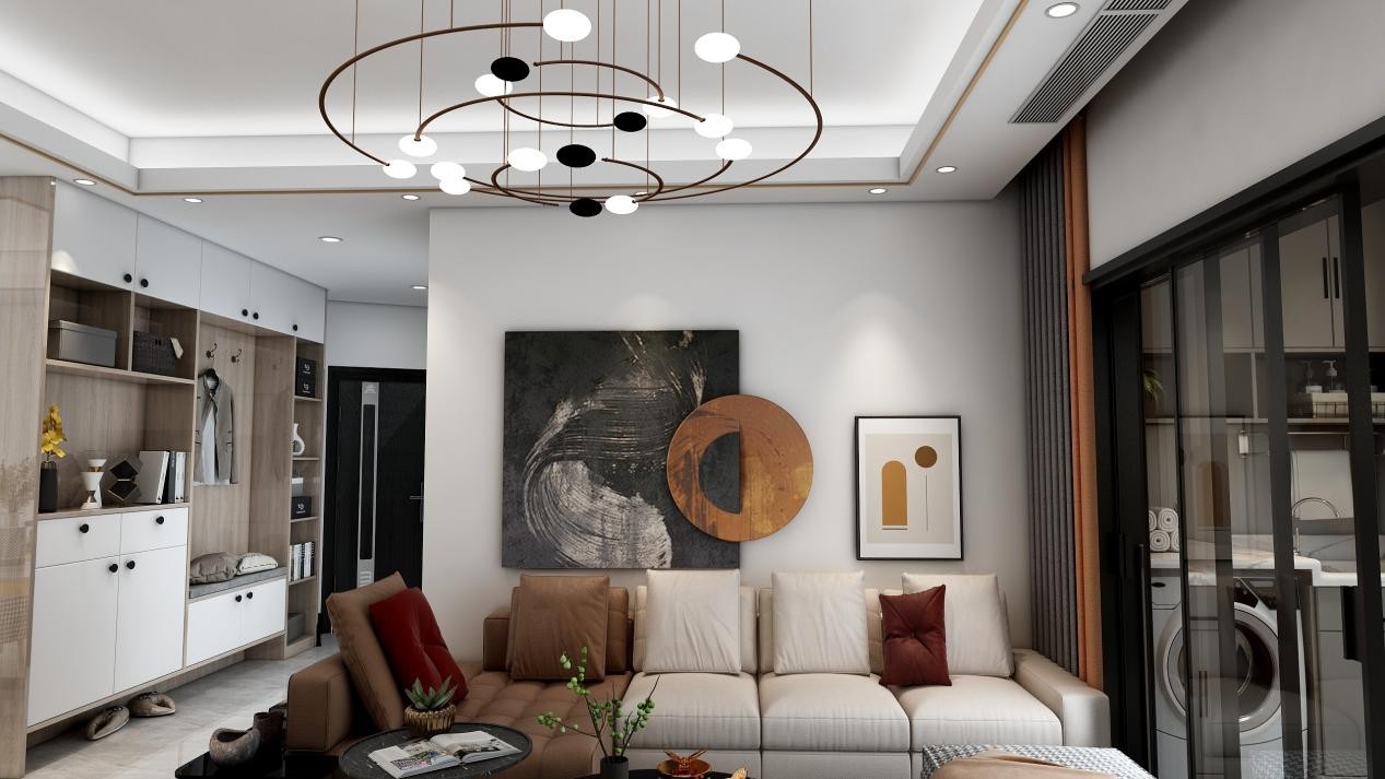 围绕都市人的美好生活愿望,设计师运用艺术的手笔,在以简约亮白为主基调的空间中,融入暖橘与深咖,调和出有温度与情感的空间图景。 灵动富有线条感的吊灯、雅奢简约的皮质,共同组合出丰富细腻的肌理层次,贯连起生活的仪式感