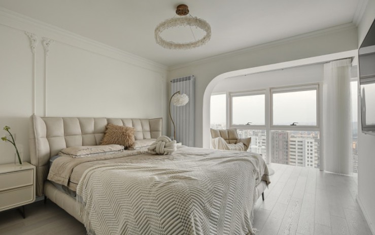 主卧延续整体的色调,与阳台之间采用一体化的设计,墙面一侧上沿采用弧形的处理,优化细节,突出空间的结构美;结合整面的落地窗,增强了空间的视觉通透感,在奶油色的衬托下,给人温暖甜美的感觉。购置***环形水晶吊灯,随性不张扬,碰撞出浪漫的美感。