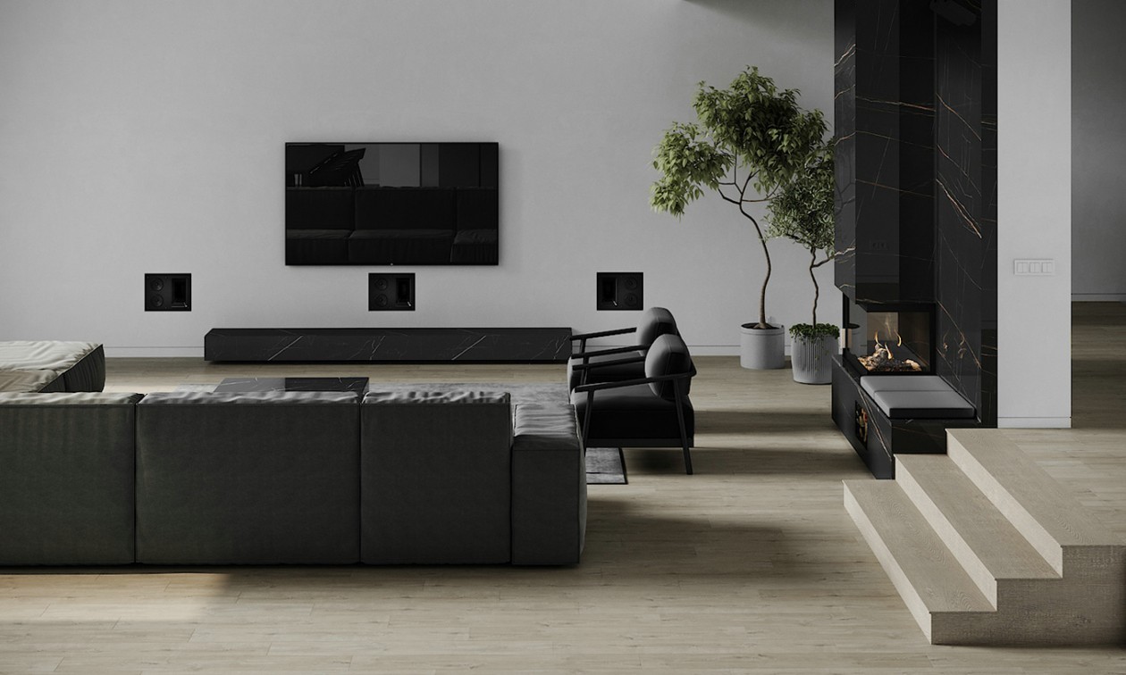 黑色的岩板桌面和墙面造型,灰色的沙发,白色的墙面,这些都在浅木色地板的衬托下更具现代感
