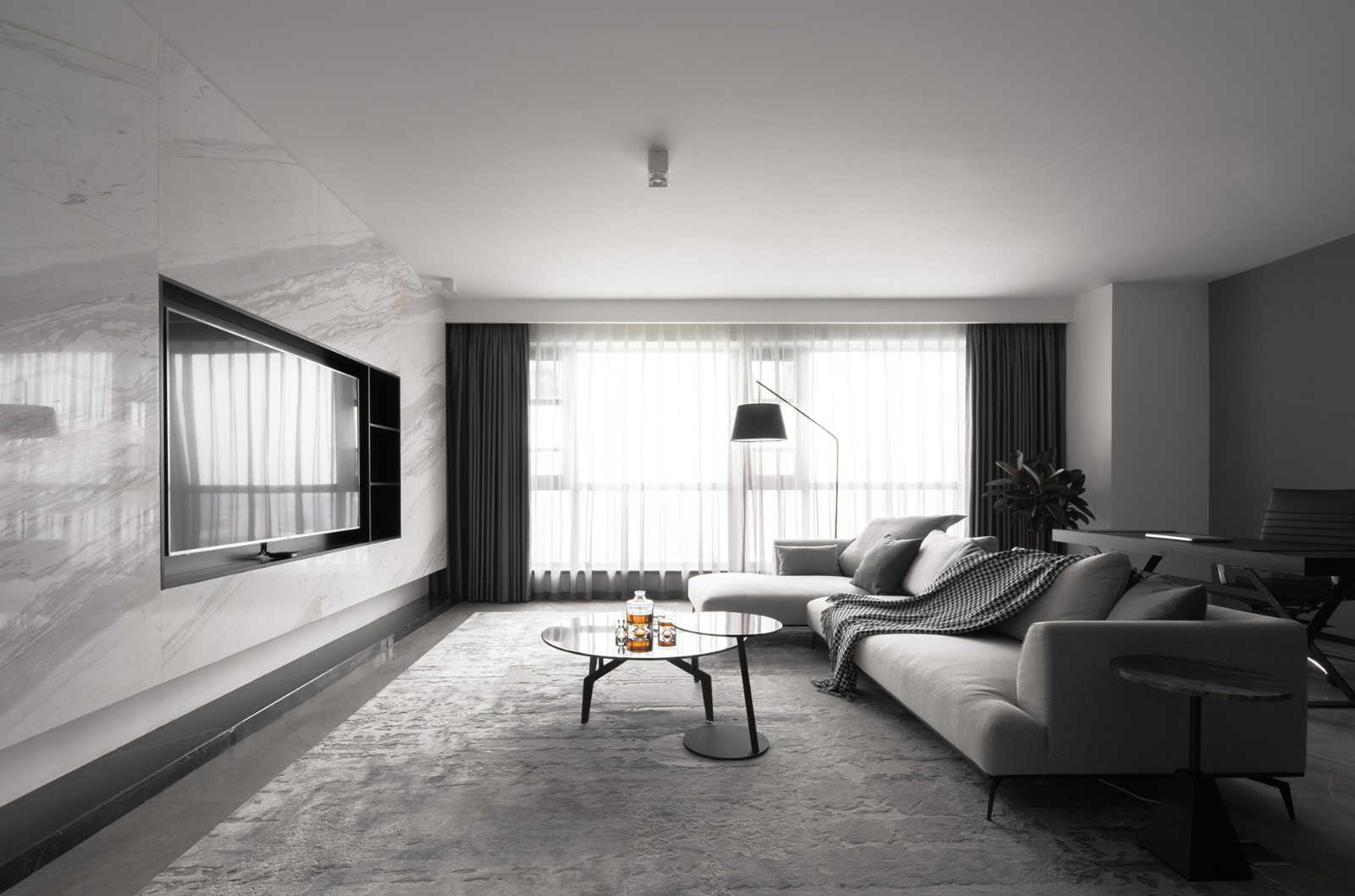出于对简约风的喜爱,客厅只保留最基本的家具,并在颜色上也只选择了低调内敛的黑白灰,告别杂乱无章。