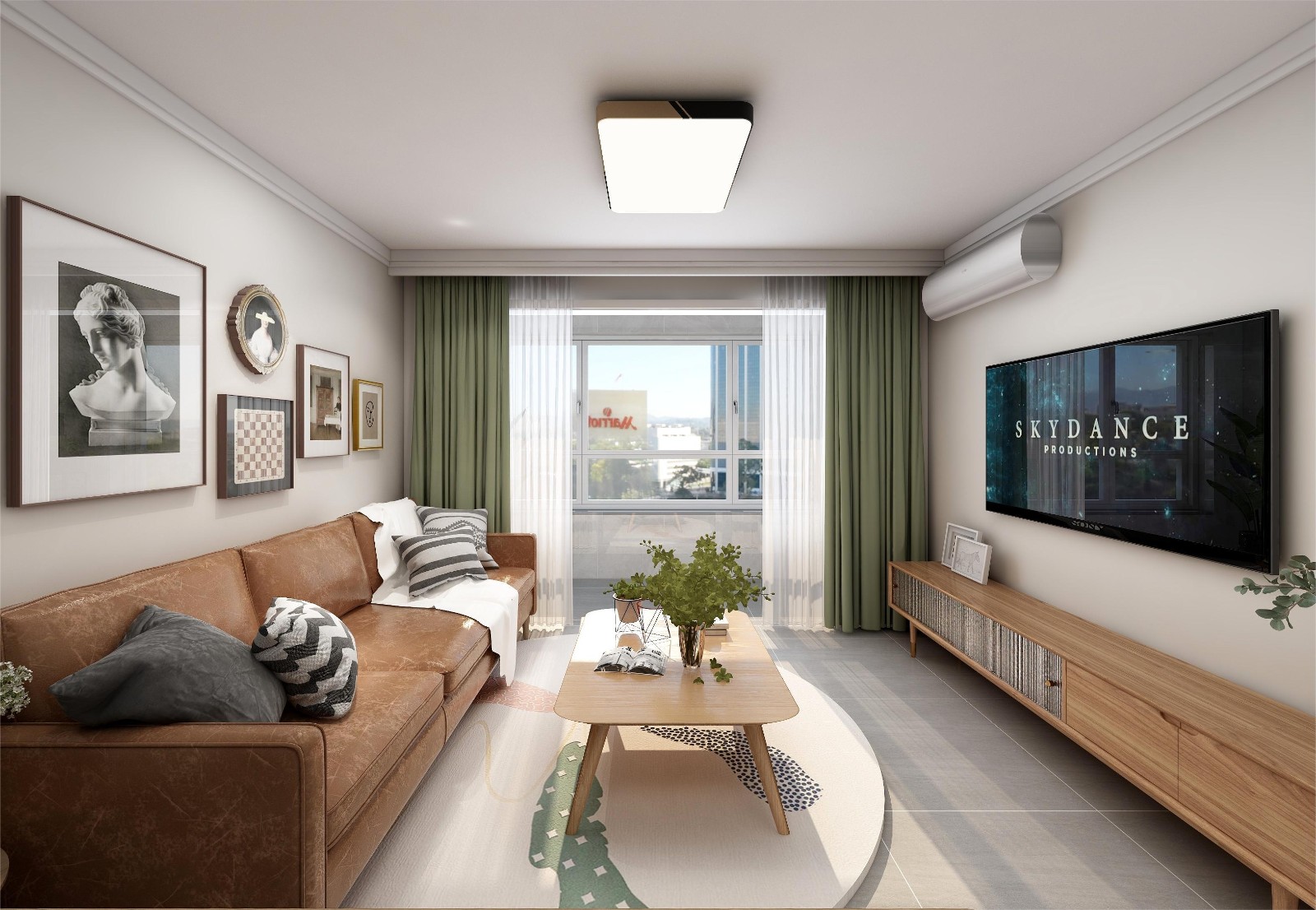 客厅地砖选用灰色微水泥款式,墙面用可可蛋奶,奶油色风格