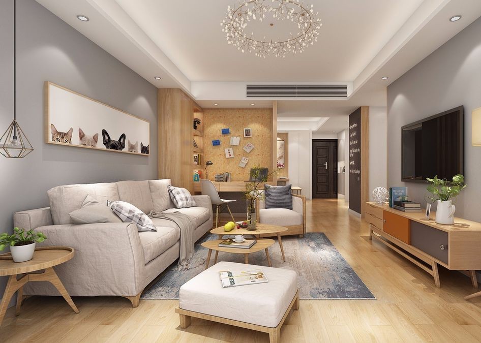 客厅简约的吊顶、纯白色的沙发背景墙和电视背景墙搭配灰色素雅的双人沙发,一切显得格外安宁,原木色的地板、电视柜,清新自然。