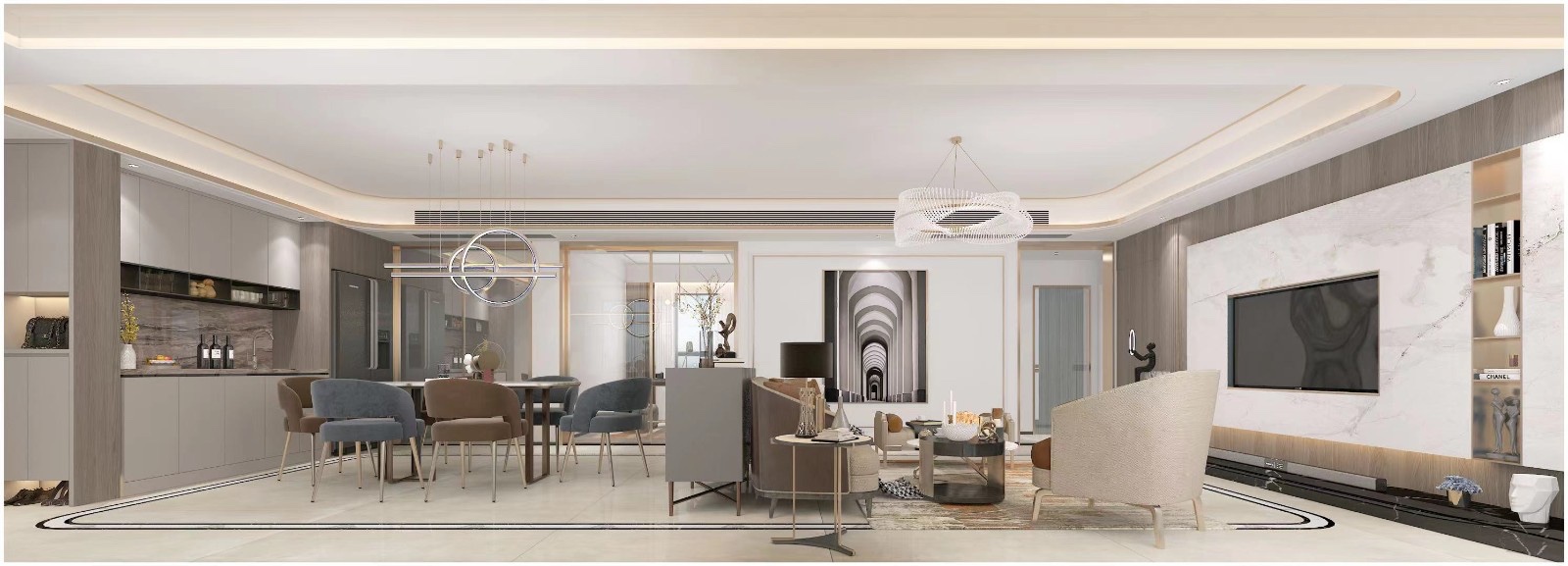 客餐厅是用的中央空调,天花做的灯槽走边,地面走了一圈波打线,地面和天花做呼应,整体看起来更加简洁