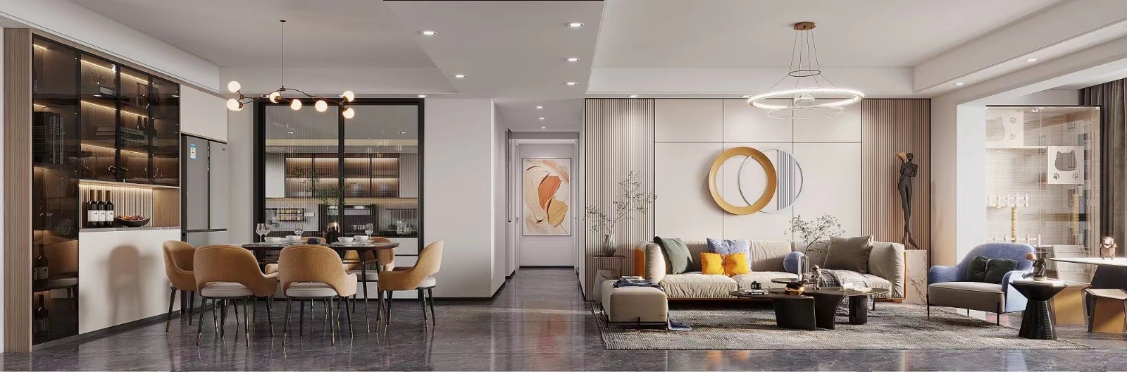 空间是一种完美的融合与平衡,现代风格的家具搭配酒柜,隐藏式的冰箱,整体简约现代。