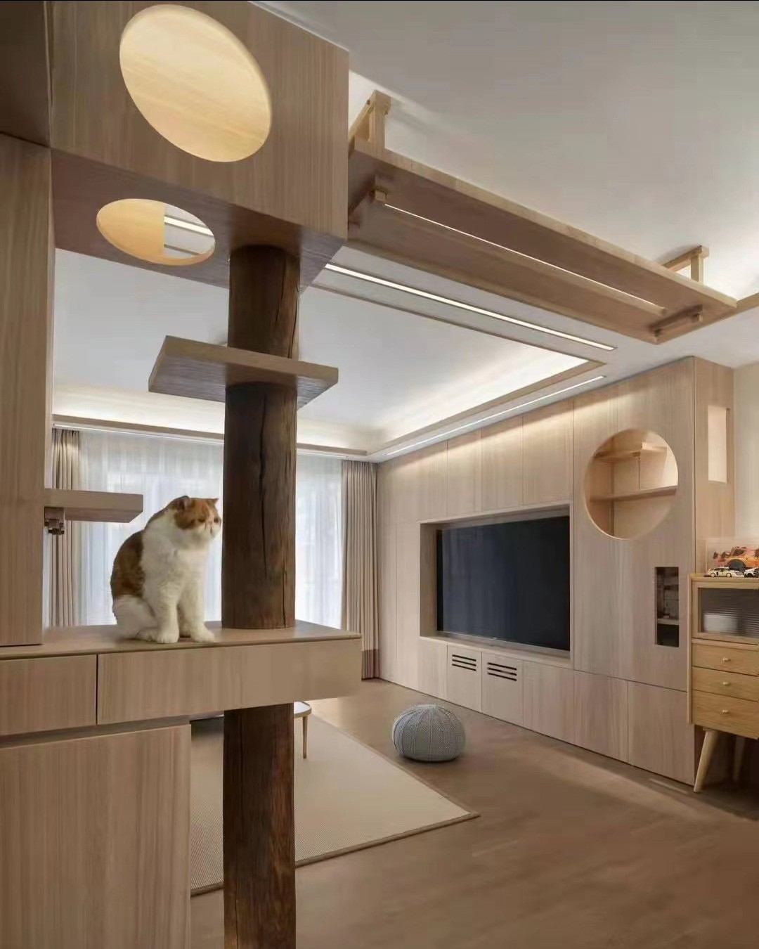 推门进客户室内,从地面到顶棚再连看天花,利用原木打造空间跑道,给小猫创造 自由生活空间。
