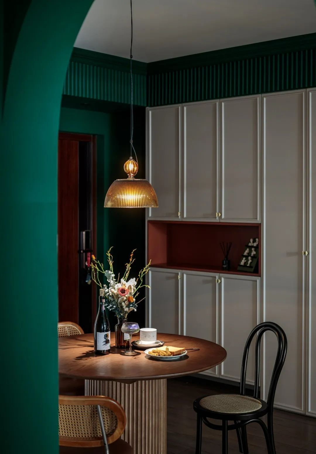剥离单纯审美意趣,古典绿与维日定绿融合,加强明暗的变幻关系,让空间更具婀娜的魅力。