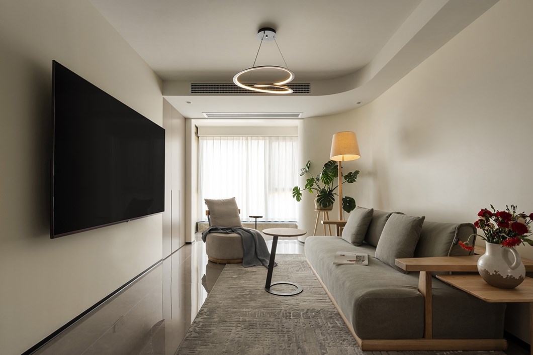 空间采用流线型设计语言, 将狭长起居空间做了柔性的处理。