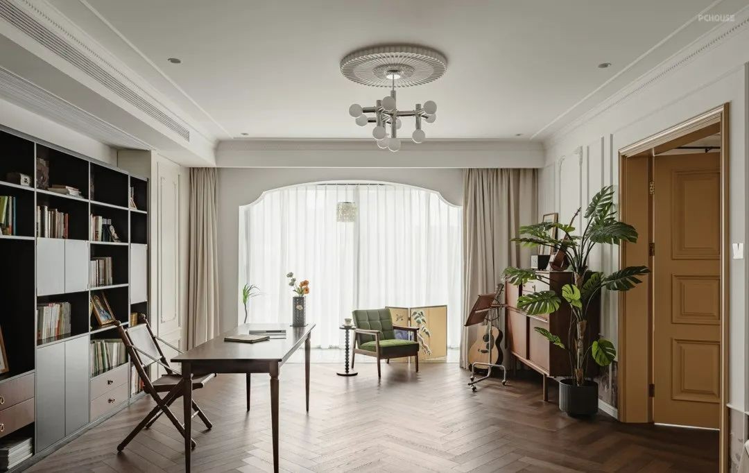 设计师选择深色系的桌椅书架,外加高挑的绿植,营造出浪漫慵懒的南洋度假风。