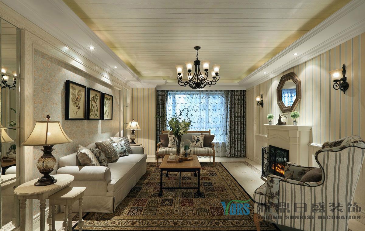 客厅的整体色调以米色为主,清新明亮。以碎花壁纸打造的墙面,与纯白色的沙发搭配,打造清新的田园氛围。