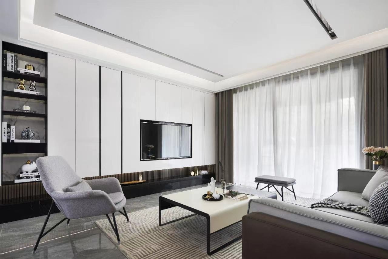 整个客厅全部使用黑白灰色系给予了空间理性简约的基调,浅灰色大理石纹的地面提升了空间的整体质感。利落的线条搭配上舒适的软装,开阔的空间为整个设计带来自由闲适的感觉,再没有多余的色彩,高雅又耐看。