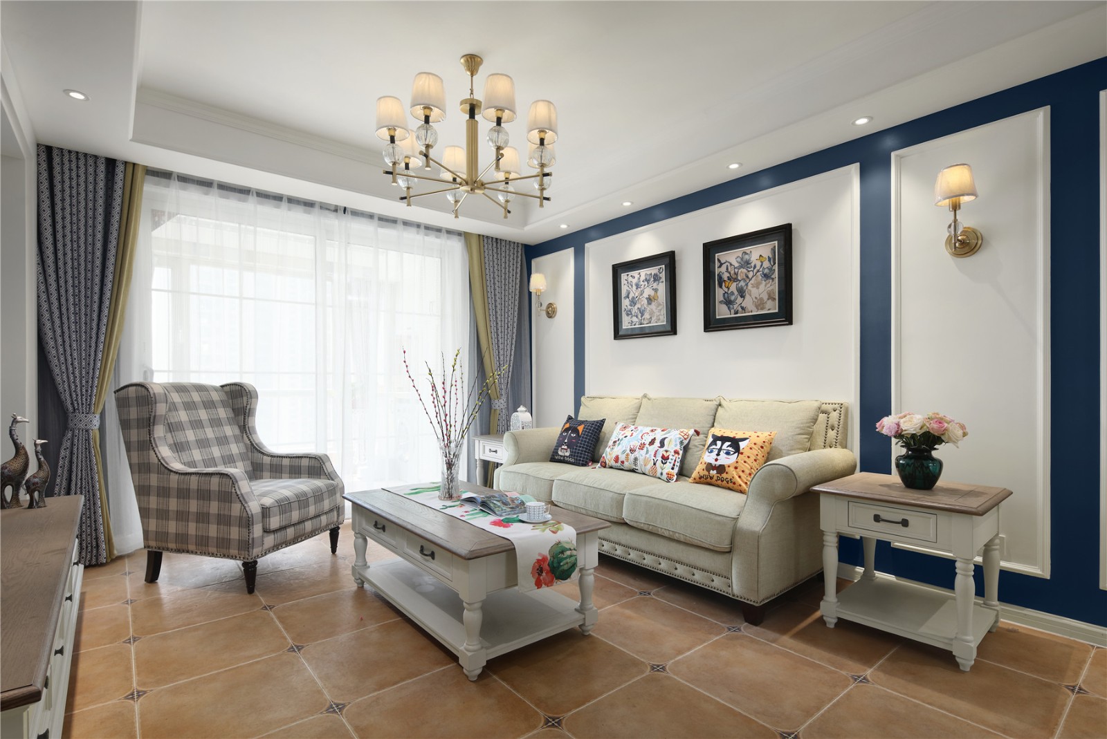 卧室整体延续清新明快的空间感,飘窗的米色与浅蓝色窗帘增加素雅视觉。
