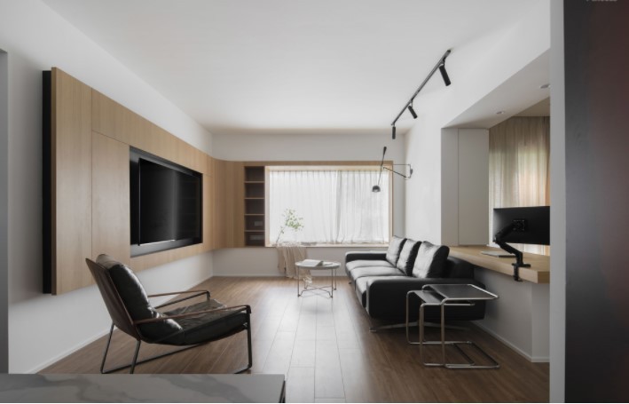 客厅的飘窗整合了原来散乱的门和窗,结合电视墙,成为一段在墙上展开的卷轴。