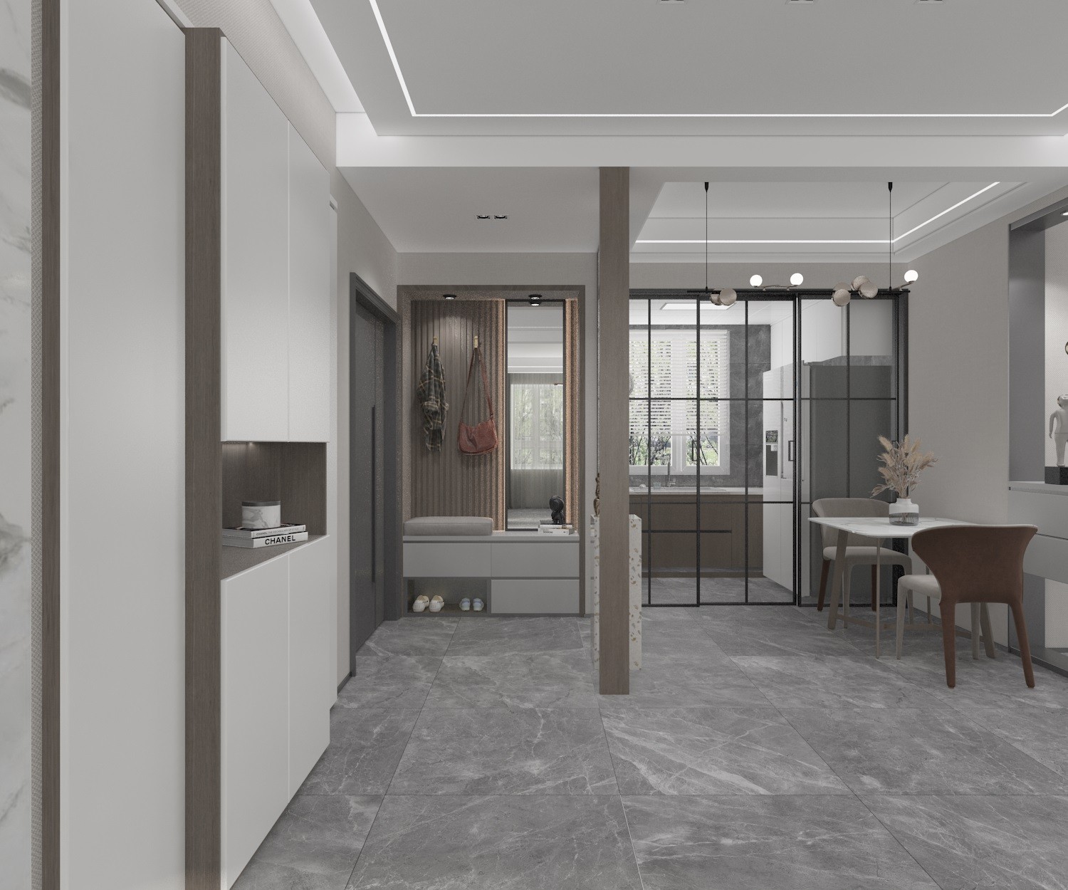 将更多功能性与可能性融入其中。嵌入式鞋柜与门厅的互动,形成了一条舒适自如的动线。