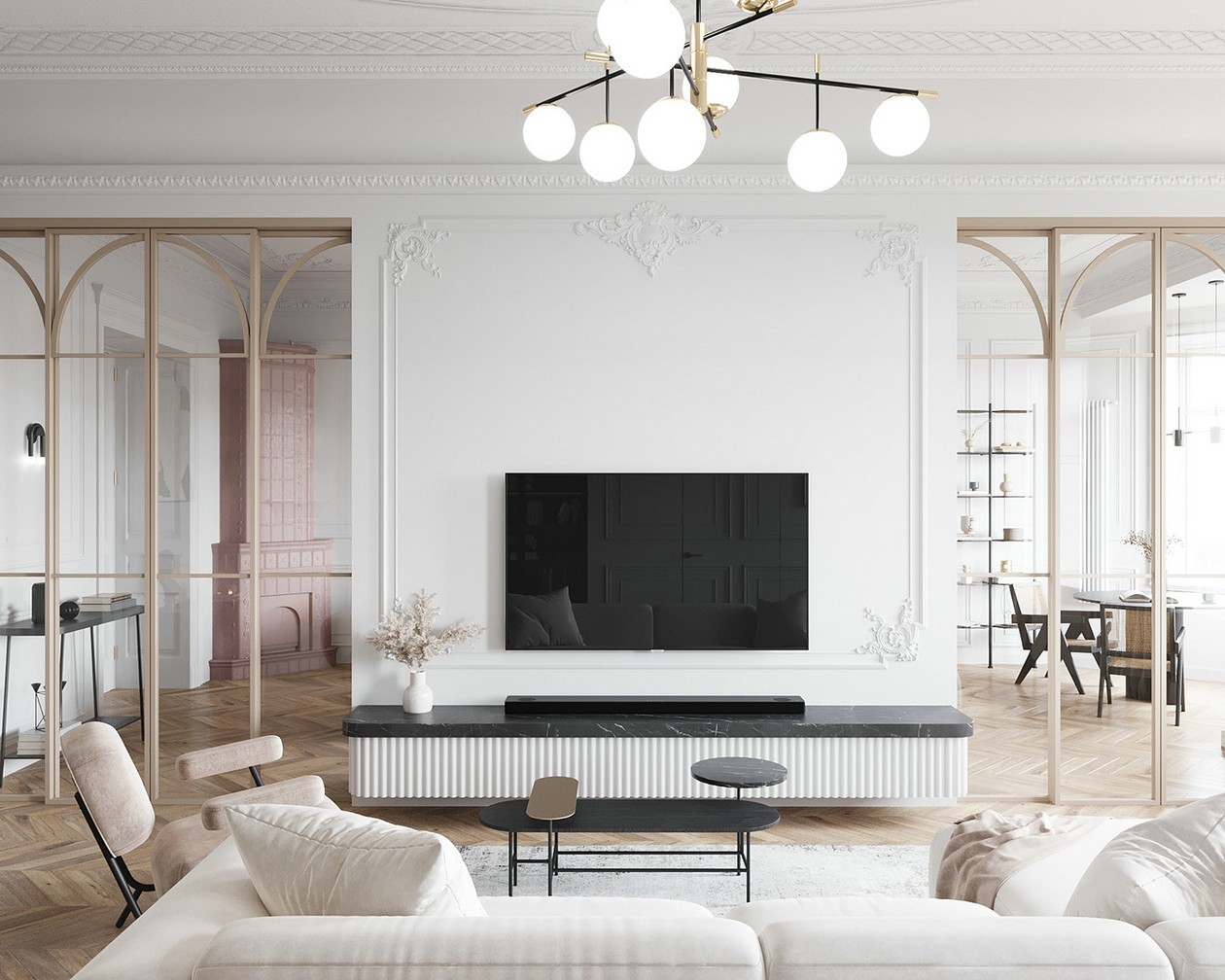柔软的法式石膏雕花与硬朗的轻奢意式金属在空间及艺术上的冲撞感给人以精神及视觉的享受。