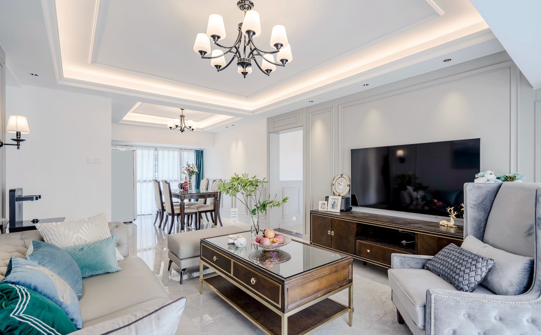 客厅整体的家具格调都属于轻美式的,因为美式家具会比较大,所以选用了高脚的,不直接落地,不显得笨重,吊顶也相较传统的美式风格做了简化