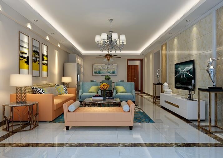 客厅的设计,电视背景墙采用墙上砖,吊顶灯照射下很是明亮