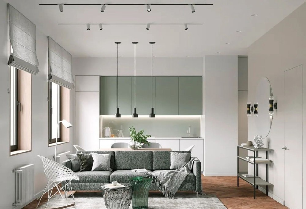 一个年轻女孩时尚住宅,由设计团队整体规划,鼠尾草绿和白色为主,有一种清新的气息从浅绿色的室内散发出来,让人想起阳光斑驳的树叶和霜吻过草。