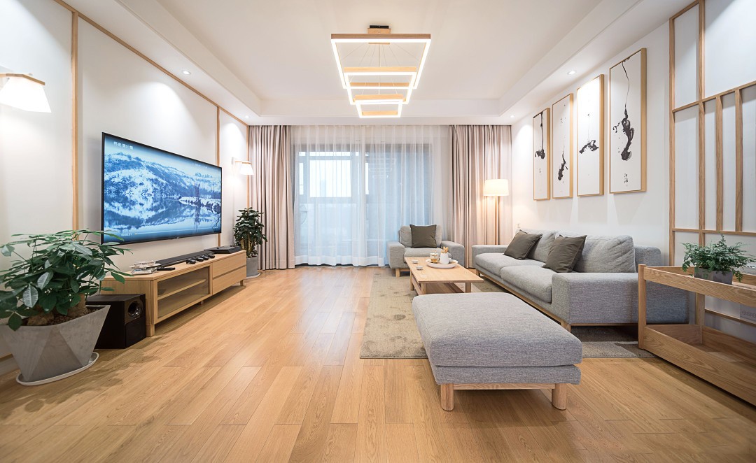全屋原木色+白色为主,客厅通铺的实木地板,背景墙原木线条装饰,muji的布艺沙发,有收纳功能的原木电视柜。