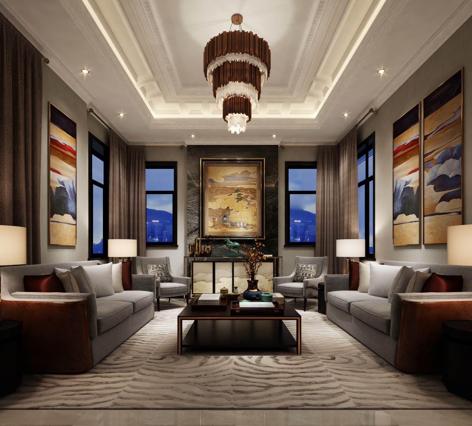 三个楼层的客厅功能不同,设计不同,地下一层作为影音室,可以休闲!新中式风格时尚中不失传统中式色彩!