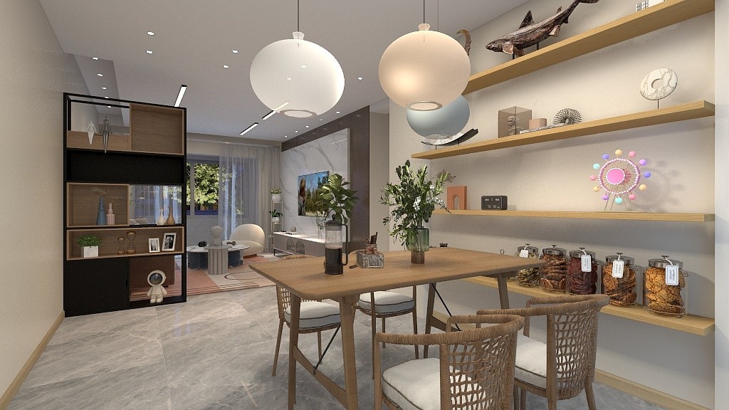 大的小的盆栽,吸收二氧化碳释放氧气,来点光合作用;墙面挂的电视机、钟、相框、;桌上不经意堆放的杂质、果盘、茶具增添生活气息