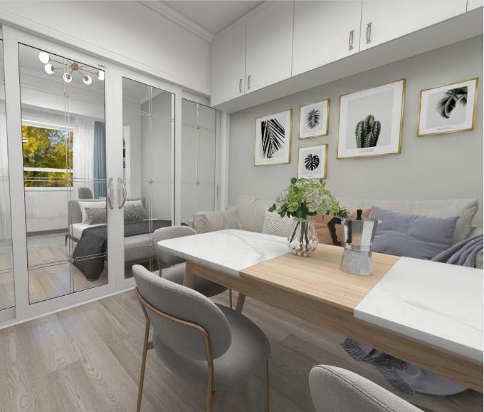 业主总共五口人居住,需要两个房间一个客厅,给他家设计主要就是合理节省空间,在保持居住的情况下储物空间也要有,所以我把入户门偏移了三十公分,在30公分处给客户做了一排橱柜,卧室和客厅中间做了移门隔断,既有了空间感也保证了采光