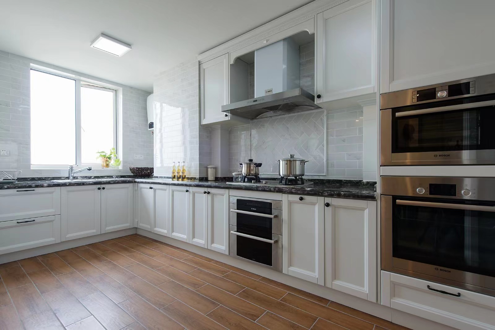 欧式的定制橱柜,嵌入式的厨具,简单漂亮实用。